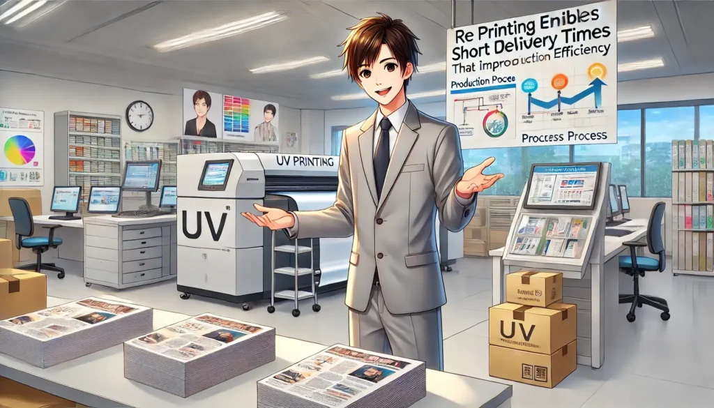 総合的に見ると、UV印刷は瞬間硬化による工程短縮と品質安定、さらに柔軟な生産計画を可能にすることで、短納期と高効率を同時に実現します。