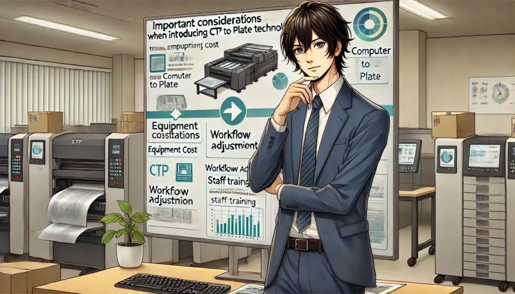 専用のCTP出力機や周辺設備の導入が必要です。初期投資は大きいですが、長期的には効率化とコスト削減の効果が見込めます。