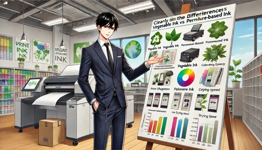 このように、石油系インキとベジタブルインキを比べると、発色や乾燥速度の点で多少の差があるものの、それぞれの特性は技術の進歩によって縮まってきています。石油系の強みであった発色や乾燥の速さは、ベジタブルインキでも十分に再現可能となり、逆に石油系では実現できない環境配慮や低VOCといった特性が評価されるようになっています。つまり選択の基準は単に印刷品質だけではなく、環境への取り組みや企業イメージをどう高めたいかという観点にまで広がってきているのです。
