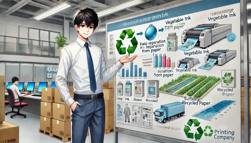 まとめると、ベジタブルインキはリサイクルの過程でインキが分離しやすいため再生紙を作りやすくし、焼却や埋立の段階でもVOCや有害物質の発生を抑え、分解されやすい性質を持っています。そのため印刷物のライフサイクル全体を通じて環境負荷を低減し、さらに経済的・社会的なメリットももたらしています。印刷物が大量に存在する現代社会において、この特性は欠かせない価値を持つといえるでしょう。