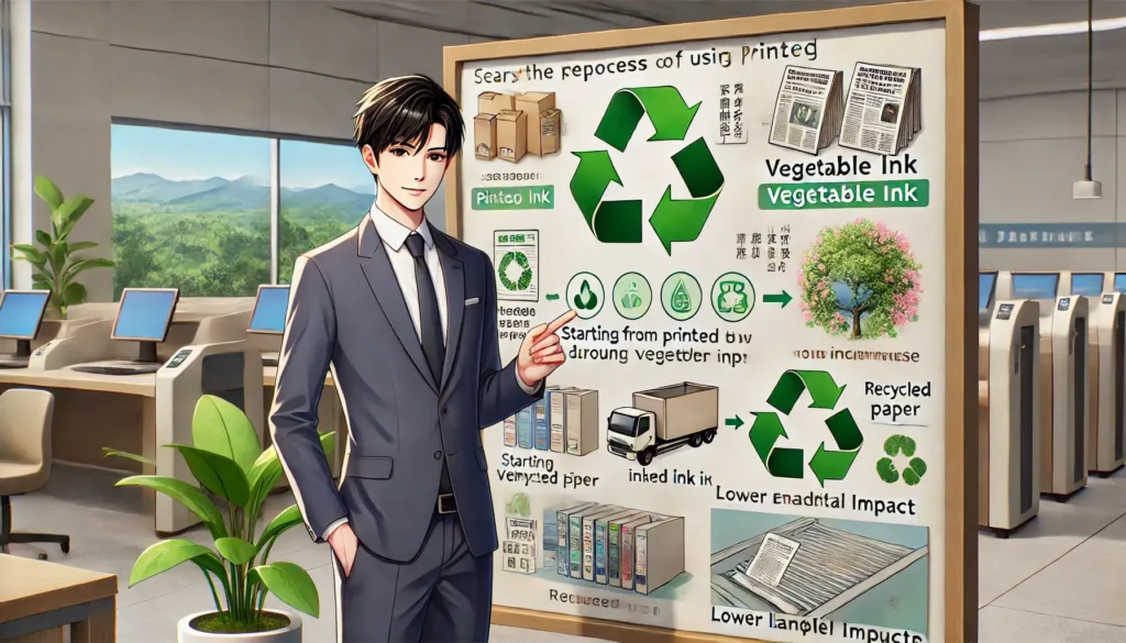 さらに、ベジタブルインキを使うことで生まれる「社会的な付加価値」も見逃せません。企業がパンフレットや報告書などで再生紙とベジタブルインキを組み合わせて利用すれば、資源循環に取り組んでいることを社外に強くアピールできます。これはCSR活動やSDGsの実践にも直結し、取引先や消費者に対して企業の環境意識を伝える効果があります。再生紙の利用が進めば、その取り組みが見える形で広がり、社会全体の環境意識を底上げすることにもつながります。