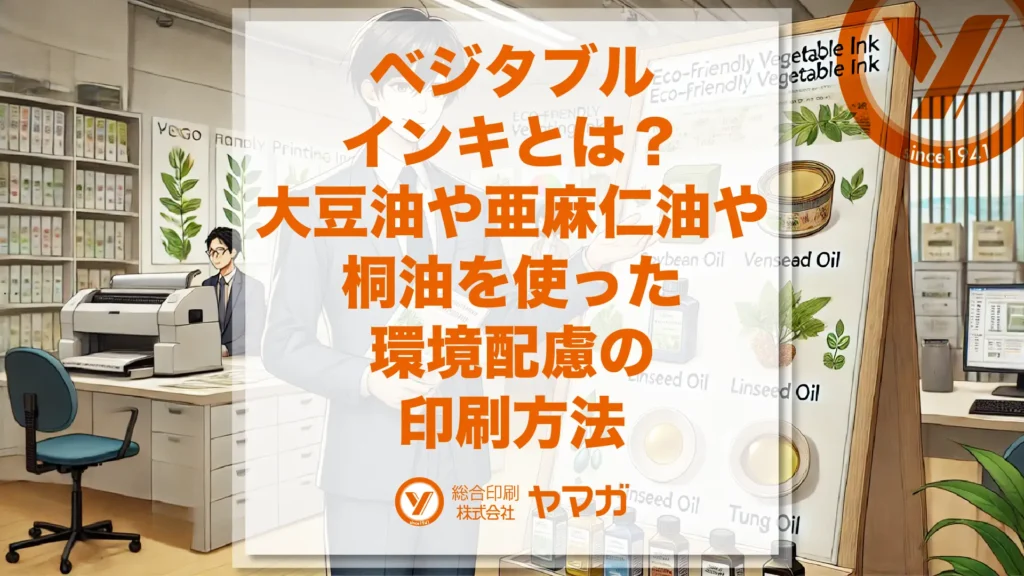 ベジタブルインキは大豆油や亜麻仁油、桐油、ヤシ油、パーム油、廃食用油など、植物由来の油を主成分にした印刷用インキです。石油系インキに比べて環境に配慮されており、VOC排出の抑制やリサイクル効率の向上が期待できます。