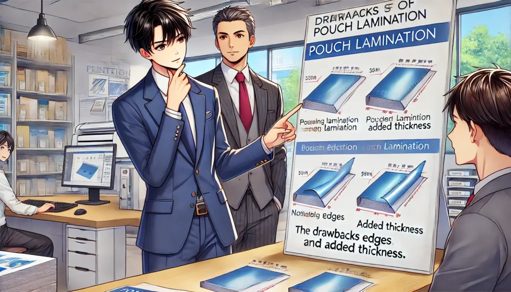 総合的に見ると、パウチ加工は耐久性や防水性という大きなメリットを持ちながらも、ミミが残って見た目がすっきりしない、厚みが出て扱いにくい、書き込みや折り曲げができない、コストや環境面で課題があるといったデメリットも抱えています。これらの特徴は加工の仕組み上避けられない部分であるため、利用する場面によってはあえてパウチ加工を選ばないほうがよい場合もあるのです。