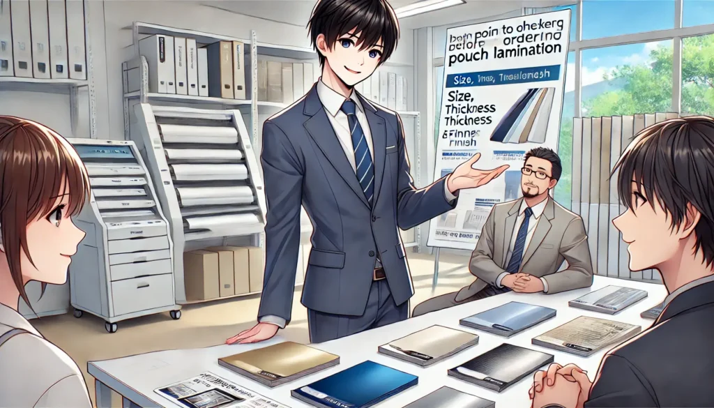 このように、パウチ加工を依頼する際にはサイズ、厚み、フィルムの種類、角の処理、透明度、そしてコストや納期といった複数の要素を総合的にチェックする必要があります。どれかひとつでも見落とすと、仕上がりに不満が残る可能性がありますが、あらかじめ確認しておけば理想に近い完成品を手にすることができます。発注前のちょっとした準備と意識が、パウチ加工をより効果的に活用するための第一歩といえるでしょう。