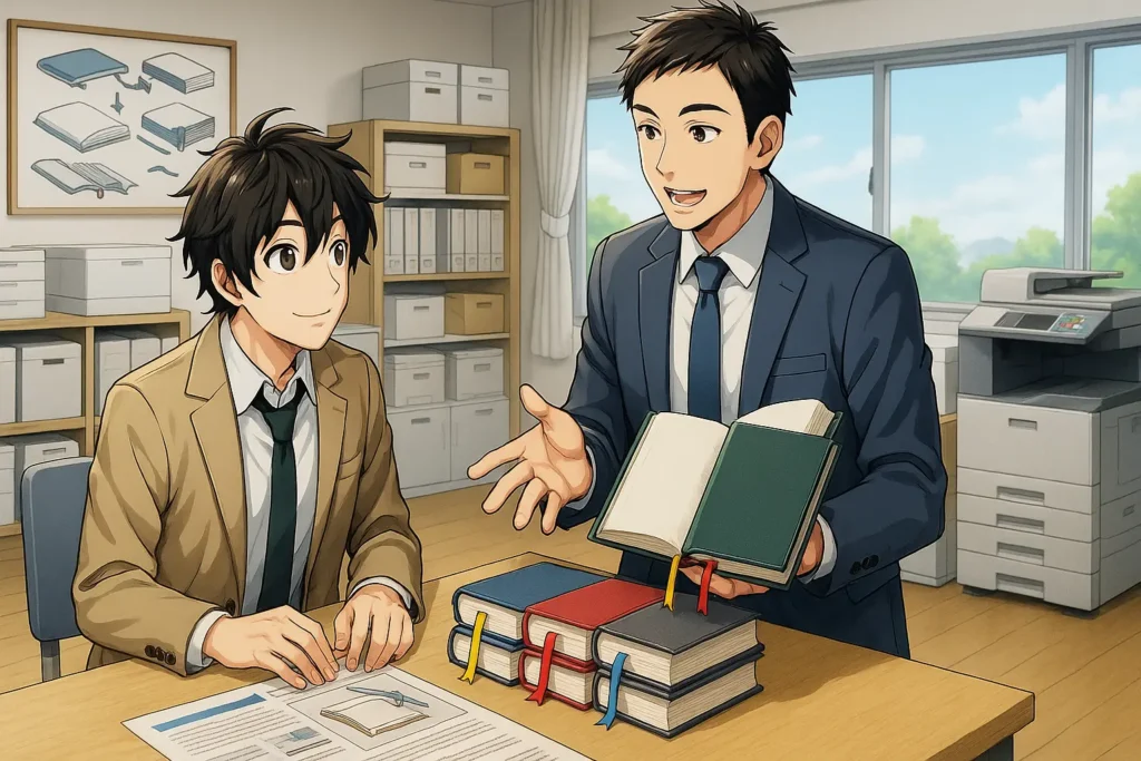 印刷会社に上製本の制作を依頼する場合、スピンの有無や色、素材を指定できることがあります。特に記念冊子や特別な出版物では、表紙や花布との調和を考えてスピンの色を選ぶと、本全体の完成度が高まります。依頼の際には「スピンを付けたい」と伝えるだけでなく、どのような色や素材を希望するのかを明確にしておくと仕上がりがイメージに近づきやすくなります。印刷会社によっては複数の見本を提示してくれる場合もあるため、実際に確認しながら決めるのが安心です。