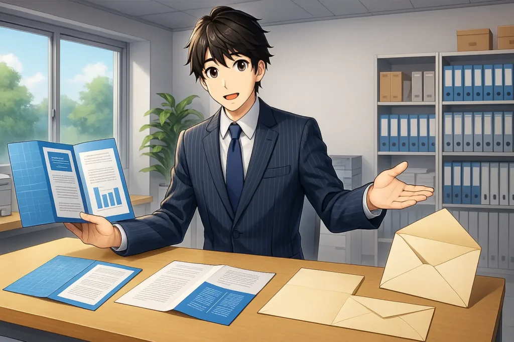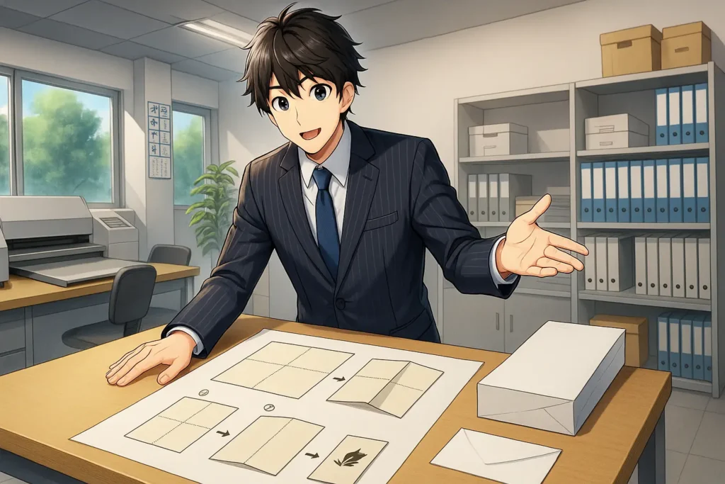 封筒への封入では、仕上がりサイズを数ミリ単位で調整し、巻き三つ折りの内側のパネルを短く設定することがポイントです。端の角を丸くすることで封入がスムーズになり、折り目をしっかりプレスしておけば膨らみも抑えられます。向きをそろえて封入することで、受け取った人が開封しやすくなり、資料の印象も向上します。サイズと折り精度、角の処理といった小さな工夫が、全体の完成度を大きく引き上げます。