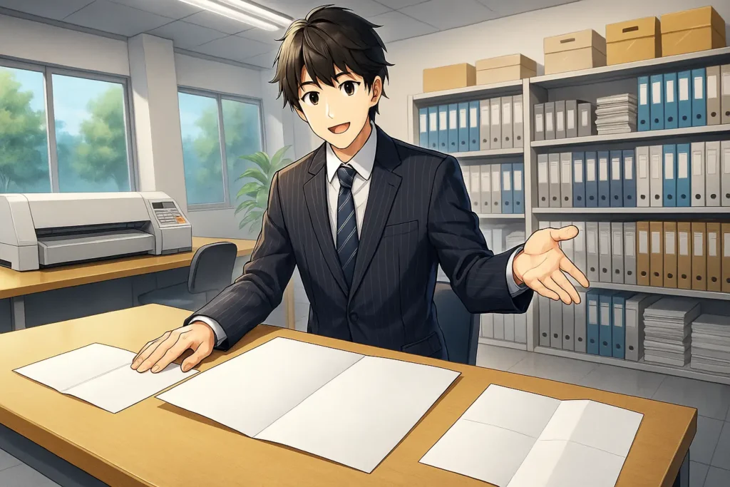 社内で手作業で二つ折りを行う場合と、印刷会社や折り加工業者に依頼する場合とでも、注意点は少し変わります。手作業の場合は、少部数であれば十分対応可能ですが、折る枚数が多いと精度がバラつきやすくなります。そのため、できるだけガイド線を引いたり、定規を使って丁寧に折ったりすることが大切です。一方で、業者に依頼する場合は、機械による精密な折り加工が可能なため、大量部数でも均一な仕上がりが期待できます。ただし、依頼時には折り方向や仕上がりイメージを明確に伝える必要があります。曖昧な指示だと、想定と違う折り方になってしまうこともあるため注意が必要です。
