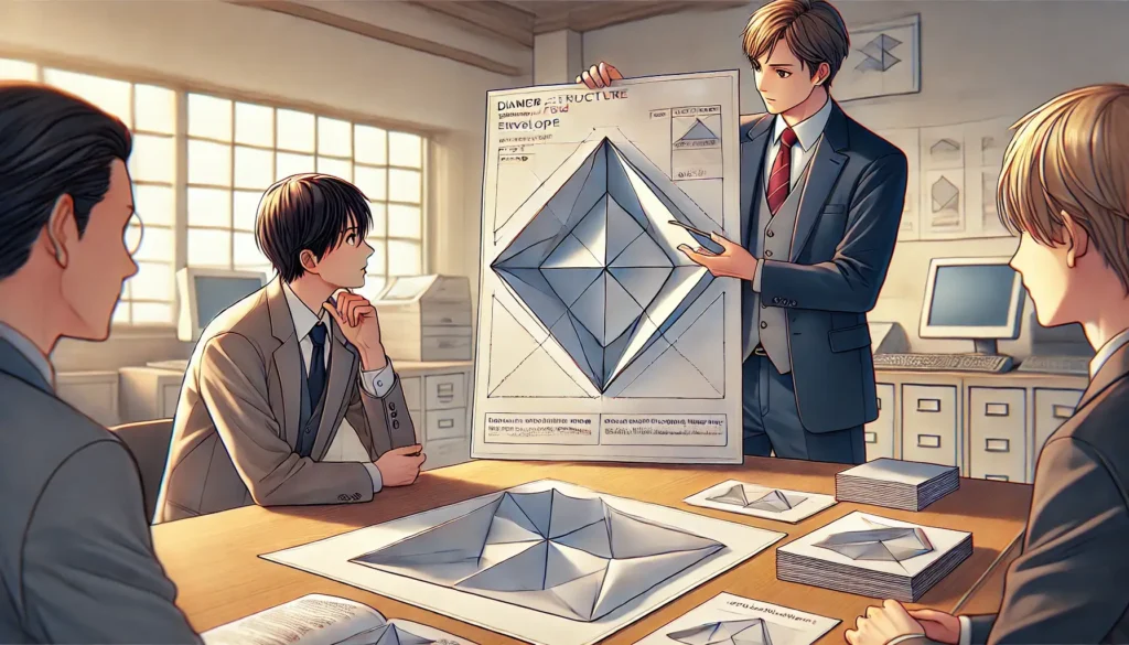 このように、ダイヤモンド貼り封筒の構造は、展開図の段階から非常に計算された設計になっています。四方から斜めに折り込むという特殊な構造が、他の封筒にはない上品な見た目と印象を生み出しているのです。この構造を理解しておくと、実際に封筒を手にしたときや制作を依頼する際にも、その仕組みがよくわかるようになり、用途に応じた選択がしやすくなります。