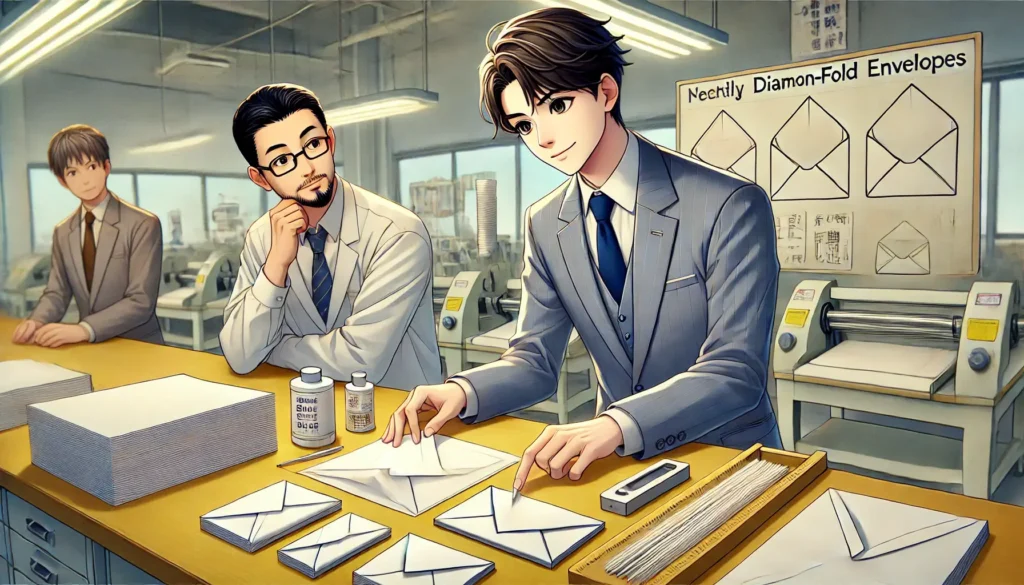このように、ダイヤモンド貼り封筒をきれいに仕上げるためには、折り位置・順番・のりの量・角の合わせ方・紙質への対応など、細かなポイントを一つひとつ丁寧に押さえることが必要です。見た目の美しさは、こうした実務的な積み重ねの上に成り立っています。正確な貼り方を意識することで、封筒の印象を高め、フォーマルな場面でも自信を持って使用できる仕上がりを実現できるのです。