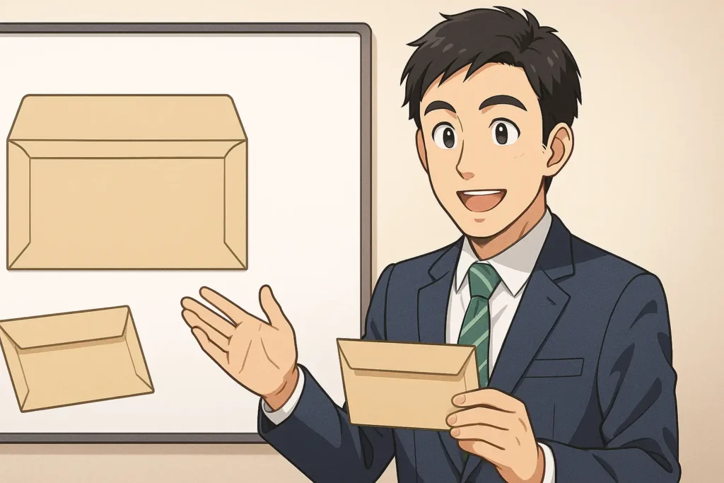 カマス貼りは、横長の洋形封筒に多く採用されている貼り方として知られています。封筒の形にはさまざまな種類がありますが、その中でも洋形封筒は、ビジネスシーンから日常使いまで幅広く活用されている代表的な形式のひとつです。このブロックでは、洋形封筒とカマス貼りの関係性や、洋形封筒ならではの形状的な特長、実際の使い勝手の良さについて、初心者にもわかりやすく丁寧に説明していきます。