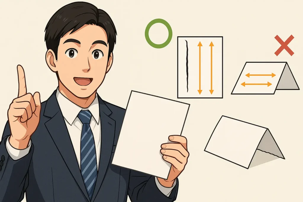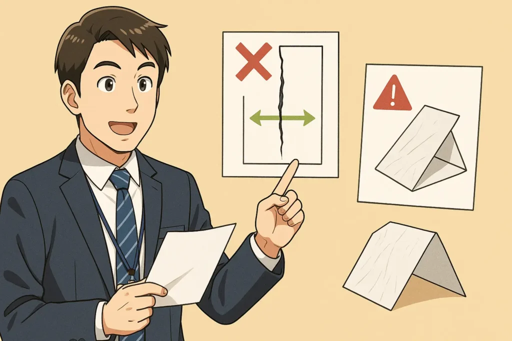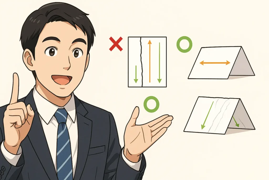 順目と逆目の違いは、理屈だけでなく、実際に印刷物を手に取ったときの印象にも直結します。順目で折られた印刷物は折り筋が滑らかで整っており、きちんとした印象を与えます。一方、逆目で折られた印刷物は背割れや皺、折りズレなどが目立ち、全体の印象が粗く見えることがあります。日常的に折り方向と紙目を意識する習慣を持つことで、品質の高い印刷物を安定して制作することができるのです。