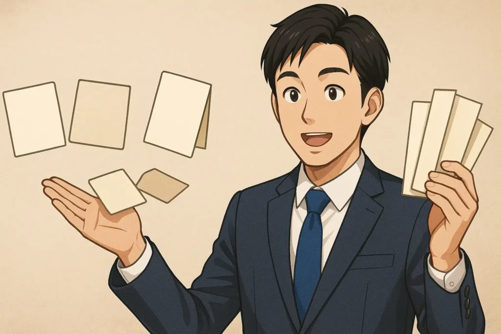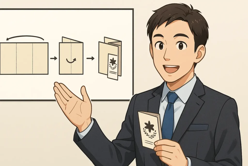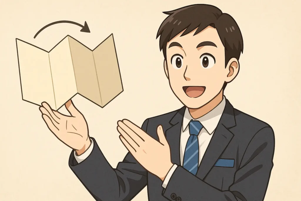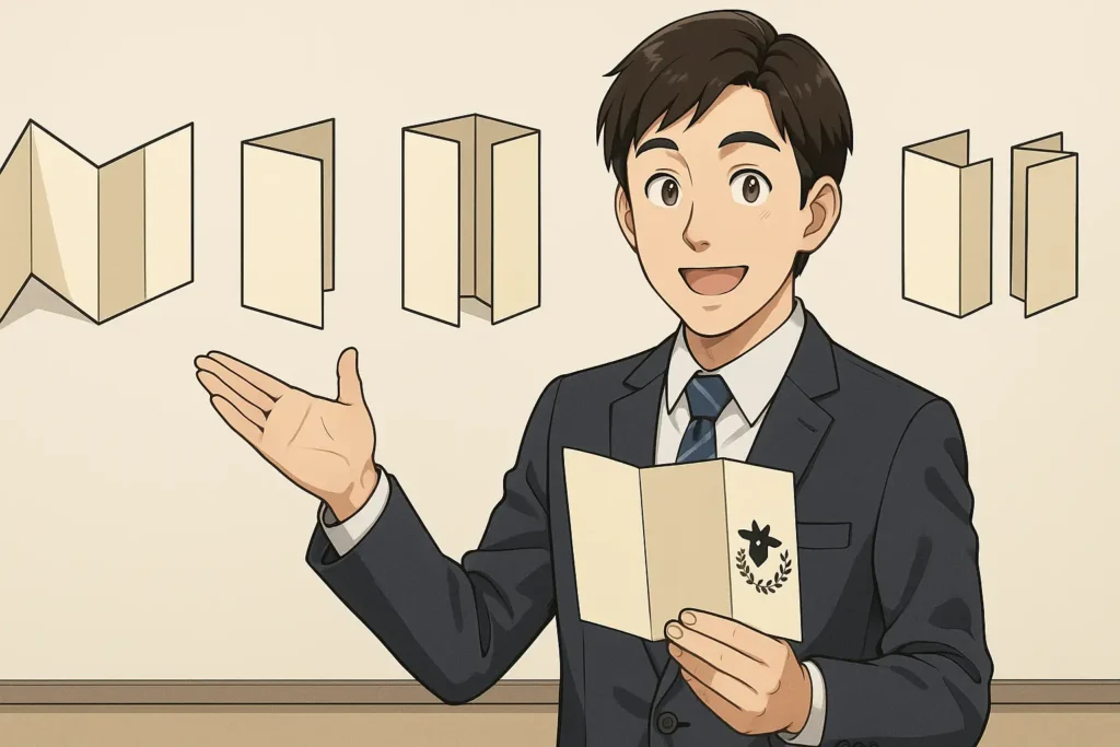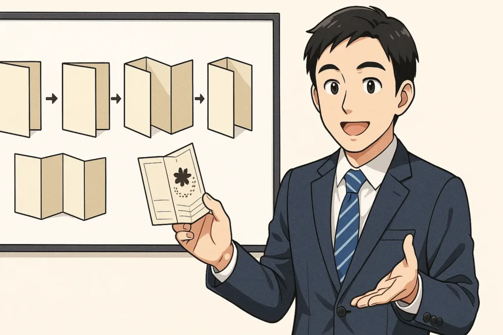 折り方の特徴を理解すると、巻き三つ折りや二つ折りとの違いも明確に見えてきます。巻き三つ折りはコンパクトで郵送に適し、二つ折りはシンプルでインパクトを与えやすい一方、ジャバラ折りは展開力に優れ、情報量の多い資料や段階的な説明をしたい印刷物に最適です。折り加工を適切に選ぶことで、印刷物の印象や伝わり方を効果的にコントロールできます。