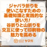 このように、谷折りと山折りの構造を正しく理解することで、ジャバラ折りの特徴を最大限に活かした印刷物の制作が可能になります。単に紙を折るだけではなく、折り方向、順番、面の配置、折り位置の精度といった細かな部分を意識することで、見た目も機能性も優れた仕上がりを実現できます。