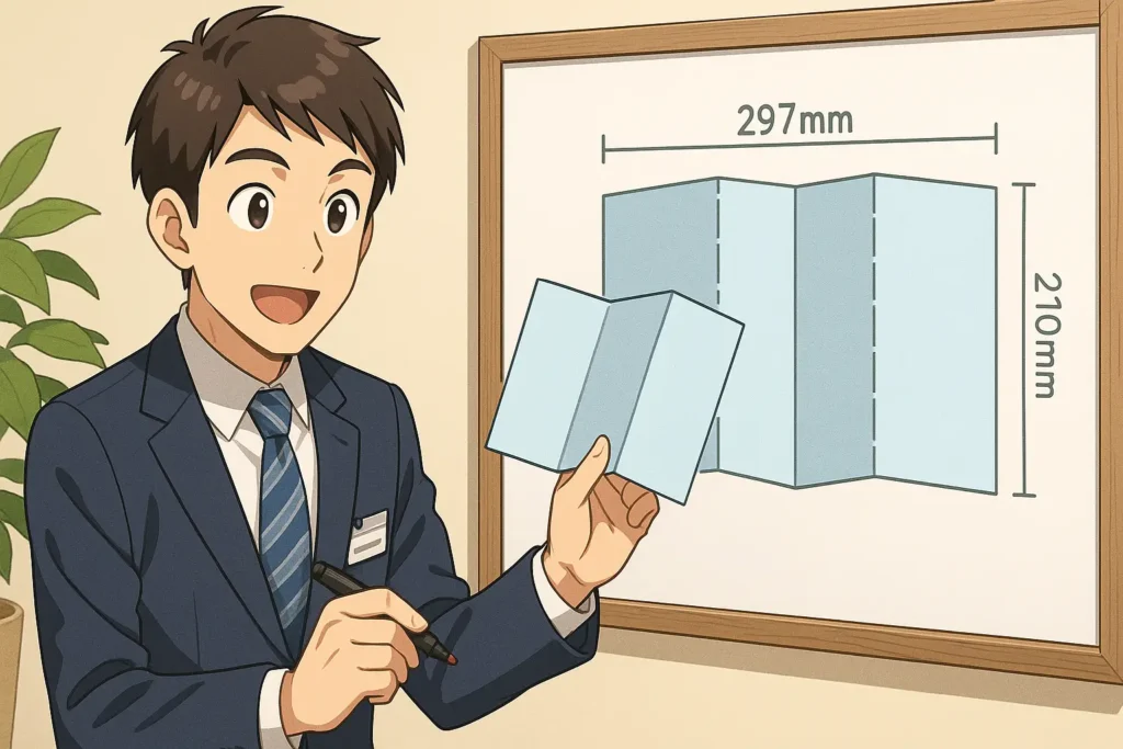 Z折りの展開サイズを決める際には、実際にどのサイズの封筒やケースに入れるのかを事前に決定しておくとスムーズです。たとえば、仕上がりをA5にしたい場合、展開サイズはA5の横幅を3倍にしたサイズ(210mm×3=630mm)になります。B5仕上がりの場合は182mm×3=546mmと計算されます。こうした寸法を正確に設計しておくことで、折りズレや断裁ミスを防ぎ、見た目の整った仕上がりに近づけることができます。
