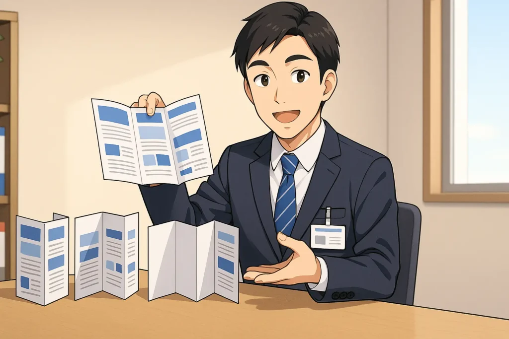 まず代表的なのが、企業の「会社案内パンフレット」です。Z折りは、会社の概要・事業内容・沿革・アクセス情報などを1枚にコンパクトにまとめるのに最適です。特にZ折りは、開いたときに3面が横に並ぶため、視覚的な流れをつくりやすく、情報を整理して見せることができます。左面に企業理念やメッセージ、中央に事業内容、右面に所在地や連絡先などを配置すると、読みやすく印象的な構成になります。さらに、折りたたむとA4サイズに収まるため、封筒やファイルにも入れやすく、営業資料や採用説明会の配布物としても活用しやすい形式です。