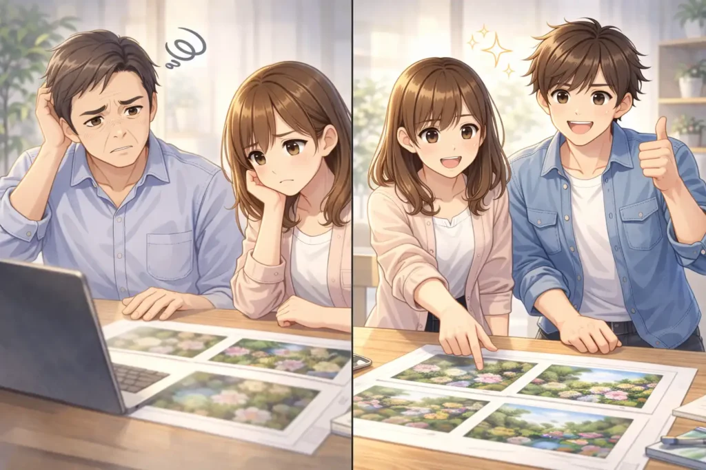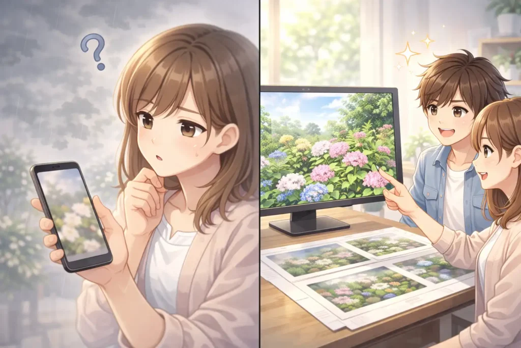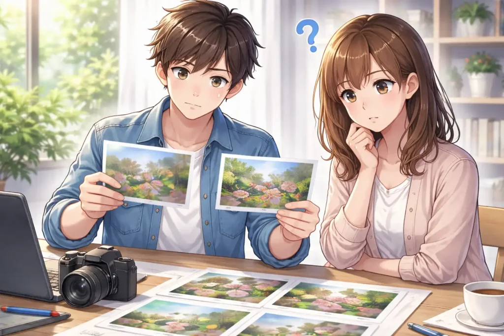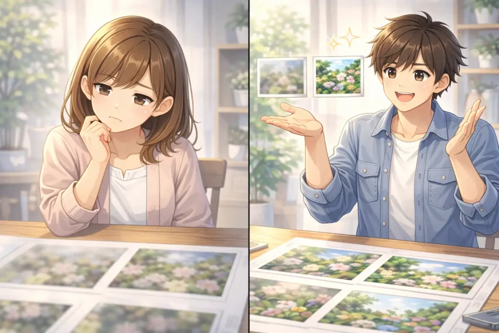 このように、眠い画像とメリハリのある画像の違いは、「どこに目が向くか」「離れて見たときに分かるか」「強弱が感じられるか」といった感覚的な視点で理解できます。難しい操作を覚える前に、まずは自分の感じ方に目を向けてみることで、画像の印象の違いが少しずつ見えてきます。