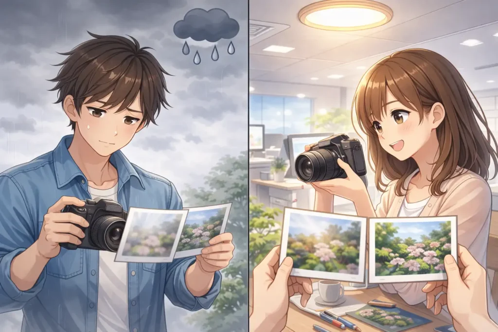 こうした原因は、一つだけで起きることもあれば、複数が重なって起きることもあります。たとえば、曇りの日に室内で自動設定のまま撮影し、あとから明るさを少し持ち上げると、眠い画像になりやすい条件がそろってしまいます。どれもよくある行動であり、特別なミスではありません。そのため、眠い画像を見たときは、「何か大きな失敗をした」と考えるよりも、「どの要素が重なったのか」を落ち着いて見直すほうが前向きです。