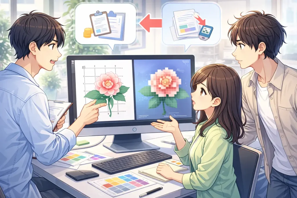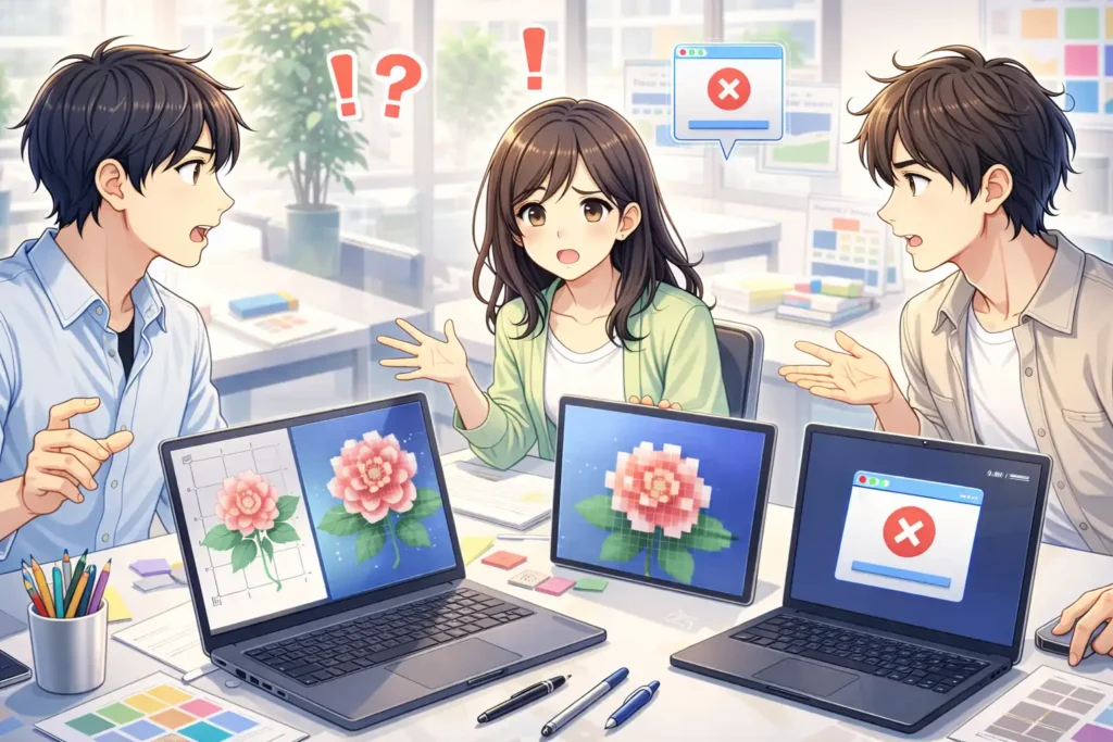 私がこの違いを強く意識したのは、社内資料用に作った図を大型モニターで表示したときでした。小さな画面では問題なかった画像が、大きな画面では一気に粗く見え、伝えたい内容が伝わりにくくなってしまいました。原因を調べてみると、元データが低解像度の画像だったことがわかりました。このとき、用途に合ったサイズと形式を考える必要性を痛感しました。