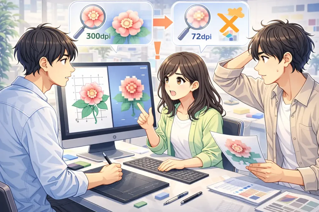 早い段階でラスタライズしてしまうことや、用途を考えずに解像度を設定してしまうことが多いです。結果として修正が難しくなったり、画質や容量で問題が出たりします。目的を意識することが大切です。