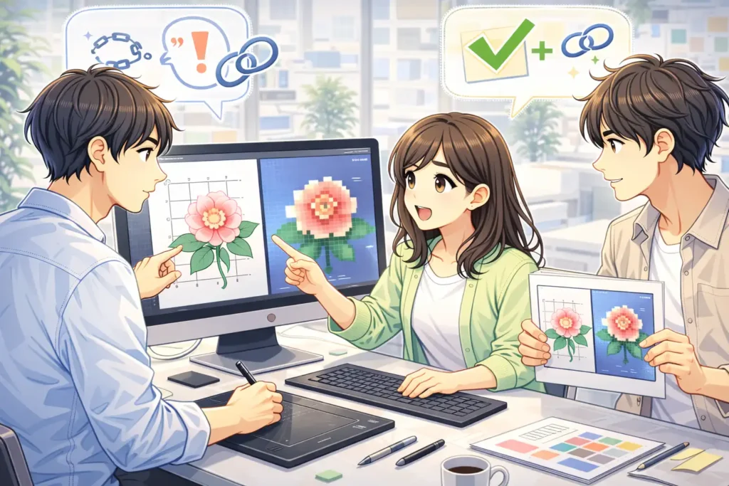 ラスタライズは、この計算処理を先に済ませてしまう作業だと考えると理解しやすくなります。どの環境でも同じ結果になるように、あらかじめ完成形を画像として固定しておくような感覚です。特に複数の人が関わる制作現場や、外部にデータを渡す場面では、この固定化が安心材料になります。自分のパソコンでは問題なく見えていたものが、相手の環境では崩れてしまうという事態は、実務では珍しくありません。