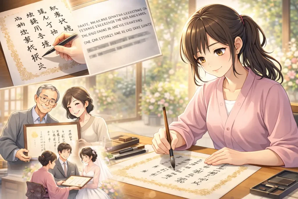 本記事では、筆耕とは何かという基本的な考え方から、写字や清書との違い、手書き文字が持つ魅力、賞状や結婚式招待状で選ばれる理由、そして筆耕が人の心に残る理由まで、できるだけわかりやすくお伝えしてきました。筆耕を知ることで、文字を見る目が少し変わり、手書き文化の奥深さにも気づいていただけたのではないでしょうか。