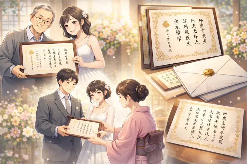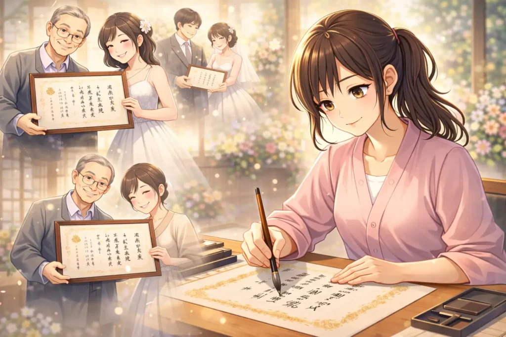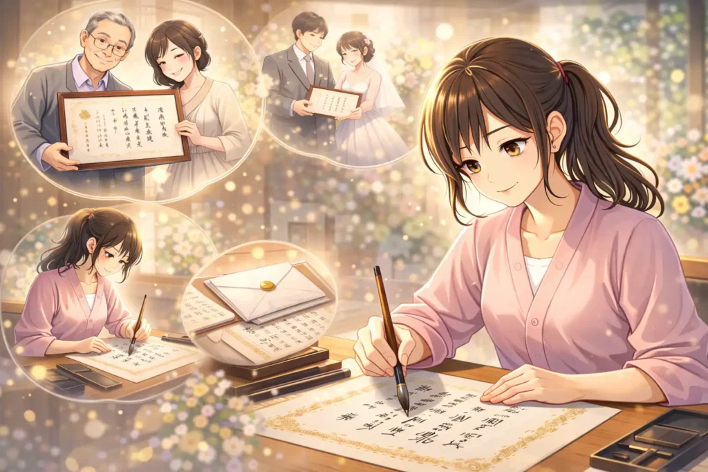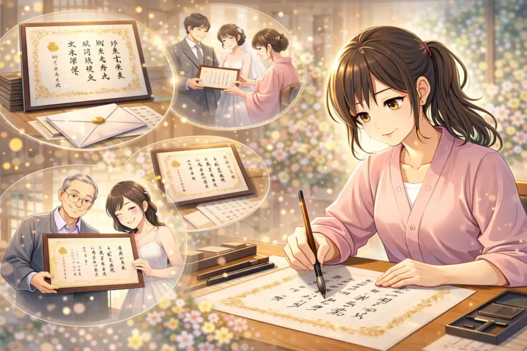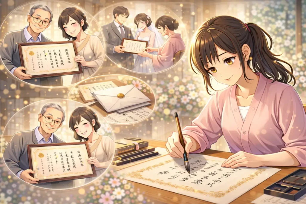 筆耕が使われる場面はとても幅広く、賞状、目録、感謝状、式典用の文書、結婚式の招待状など、人生の節目や大切な場面で活躍しています。こうした場面では、内容だけでなく見た目の印象も重要になります。整った文字は、書かれた言葉の価値をより高め、受け取る人の心に残りやすくなります。
