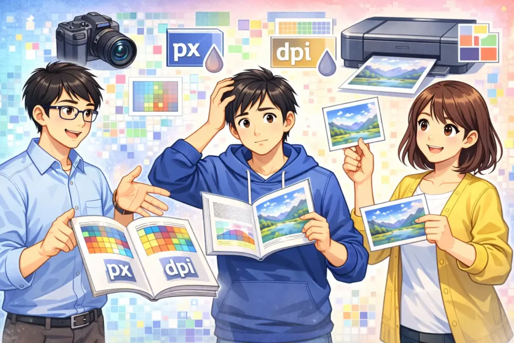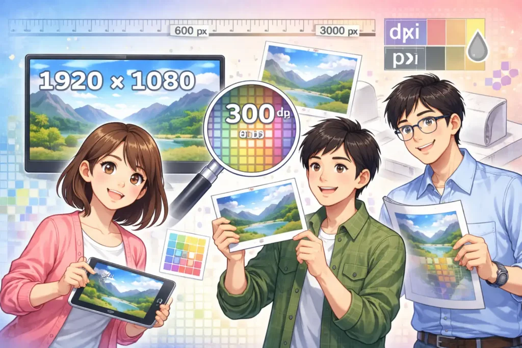 ここまでで、pxという単位が何を意味しているのか、そして画面表示とどのように関係しているのかが、少しずつ見えてきたのではないでしょうか。次のブロックでは、解像度dpiとは何かを、印刷との違いという視点から、さらに分かりやすく解説していきます。