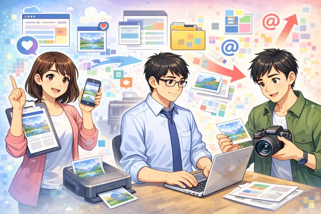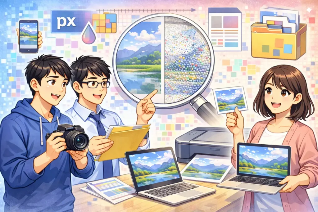 ピクセルの仕組みを知ることは、デジタル画像を自由に扱えるようになるための第一歩です。画像がきれいに見える理由、粗くなる理由、サイズ調整で失敗しない考え方が分かるようになると、これまで何となく行っていた作業にも自信が持てるようになります。資料作成、Web更新、写真印刷、SNS投稿など、日常のさまざまな場面で、その知識は確実に役立ちます。