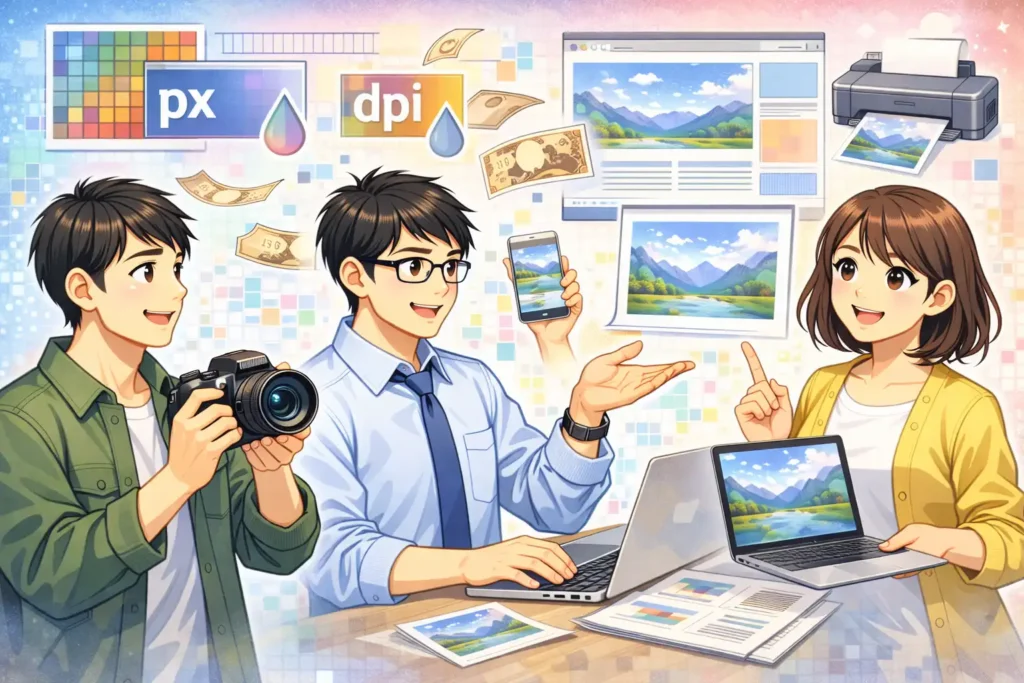 さらに、pxという単位や、解像度dpiという言葉も、画像を扱う上では欠かせない要素です。pxは画面上のピクセルの数を表し、dpiは印刷時の密度を表します。この二つの役割を正しく理解していないと、画像サイズの調整や印刷時の仕上がりで迷ってしまう原因になります。しかし、考え方自体は決して難しいものではなく、ポイントさえ押さえれば誰でも理解できる内容です。