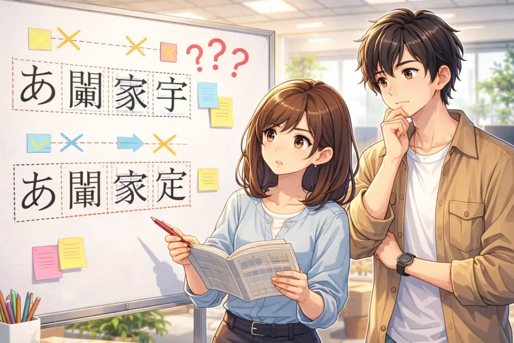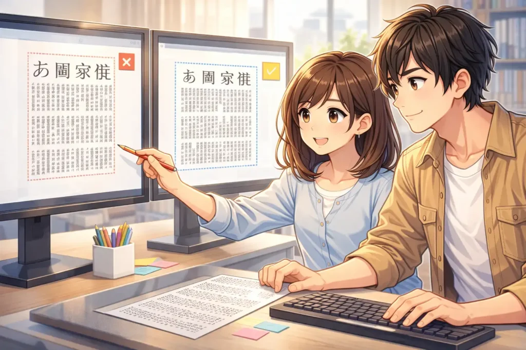 もうひとつ多い失敗は、句読点や記号まわりの違和感です。「、」や「。」の前後に不自然な空きが生まれると、文章の流れが途中で止まっているように感じられます。読む人は意味ではなく、見た目の違和感によってリズムを乱されてしまいます。ツメ組みを意識していれば、こうした部分も自然な距離感に整えることができます。