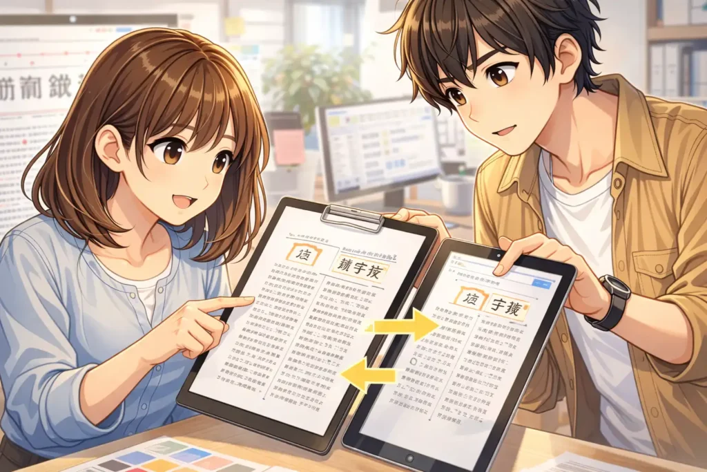 文字組みを自然に整えるためには、比較もとても効果的です。ベタ組みの状態と、少しツメ組みを施した状態を並べて見比べるだけで、違いははっきりと感じ取れます。この体験を重ねることで、自分の中に基準が少しずつ蓄積されていきます。その基準こそが、ツメ組みを上達させる最大の財産になります。