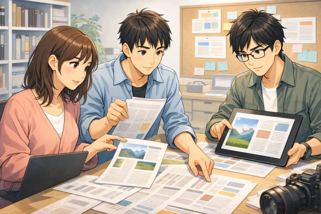 実際の制作現場では、まず原稿が用意され、それをもとに文字を配置し、写真や図版を組み合わせ、全体のレイアウトを整えていきます。このとき、組版の考え方があるかどうかで、作業の質が大きく変わります。単に配置するだけの作業と、読む人の視線や理解を考えた配置とでは、完成した紙面の印象がまったく違ってきます。