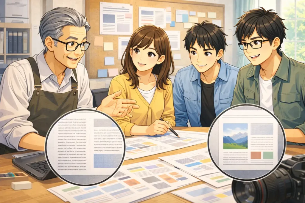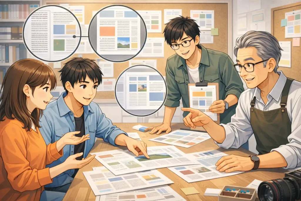 さらに、写真や図版との距離感も失敗しやすい部分です。近すぎると境界が分かりにくくなり、離れすぎると関係性が伝わらなくなります。どの文章とどの写真がつながっているのかを、読者の目線で確認することが大切です。