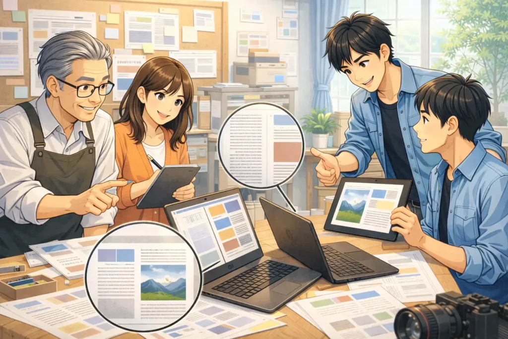 初心者の方が失敗しにくくするために、まず意識してほしい考え方は、自分ではなく読む人の立場で見ることです。作っているときはどうしても作り手の視点になってしまいますが、完成したら少し時間を置いてから見直すことで、客観的な目で紙面を確認しやすくなります。