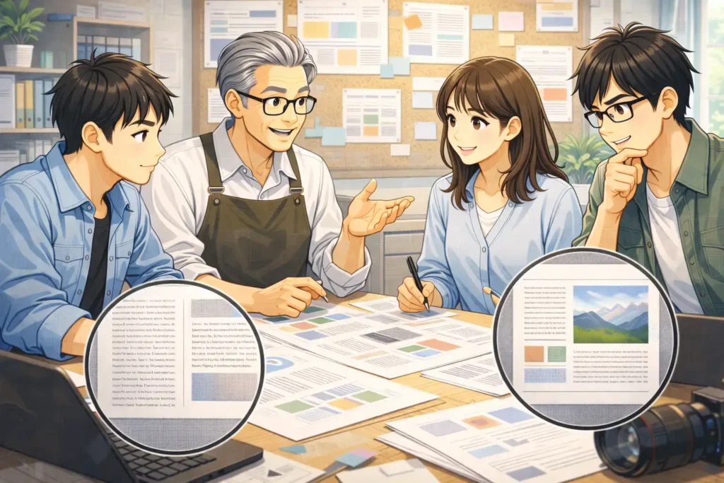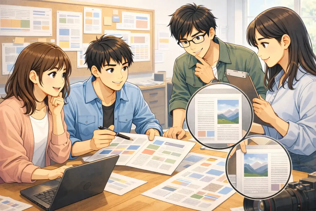 これから本記事では、組版とは何かという基本から、文字組、デザイン、写真や図版、DTPとの関係まで、順番にわかりやすく解説していきます。専門知識がなくても理解できるよう、できるだけやさしい言葉で説明していきますので、印刷やデザインに詳しくない方でも安心して読み進めていただけます。
