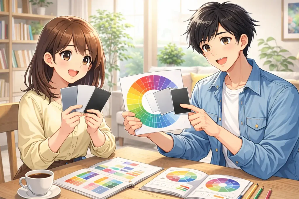 無彩色はどんな色とも合いやすく、失敗しにくいため初心者にとても扱いやすい色です。まず無彩色をベースにして考えることで、自然にまとまった配色ができるようになります。色選びに迷う方には特におすすめです。