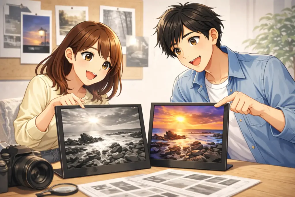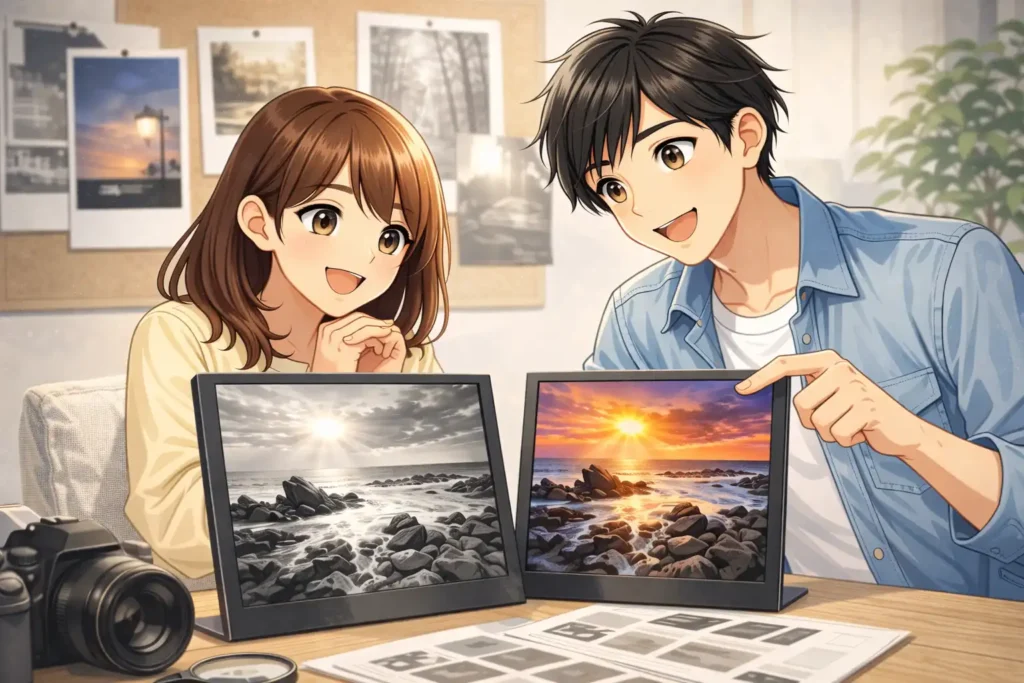 私も写真の明るさを調整するとき、色をつける前に白黒に近い状態でバランスを見る方法を知ってから、仕上がりがぐっと良くなりました。無彩色の状態で明暗が整っていると、その上に色をのせても自然に見えるからです。