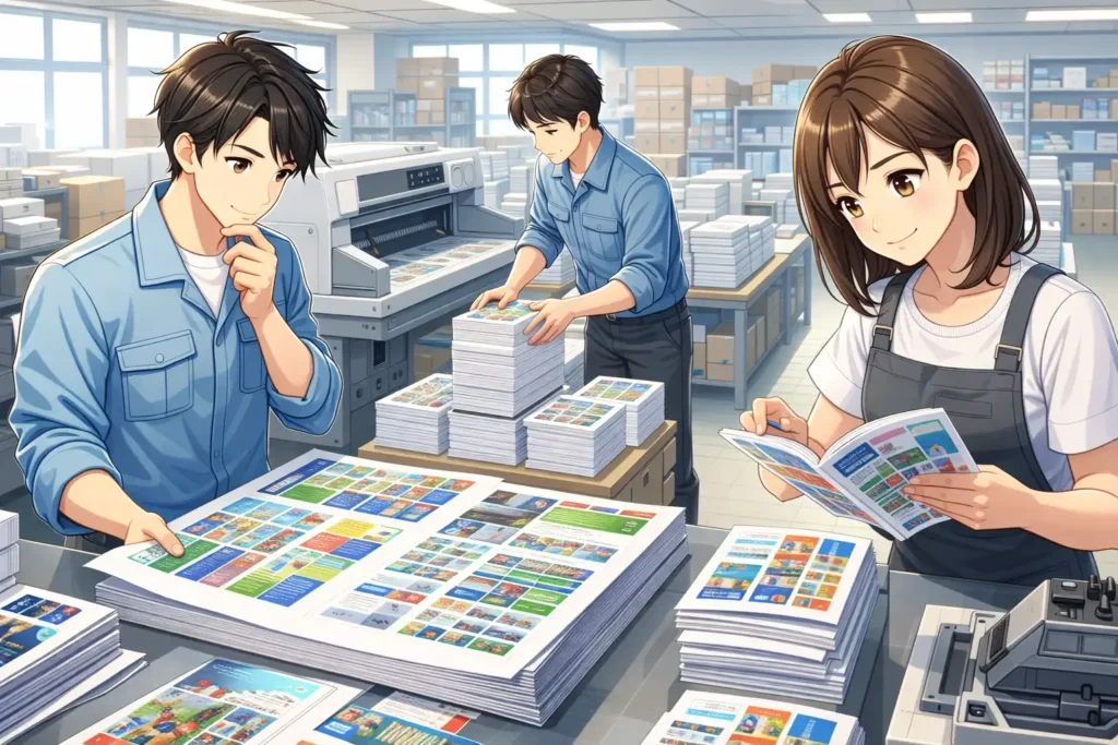 この検品工程は、印刷物の最終チェックとも言える段階です。ここで問題を見つけることができなければ、そのままお客様の手元に届いてしまいます。そのため多くの現場では、複数のスタッフで確認したり、チェックリストを使ったりと、ミスを防ぐ工夫がされています。