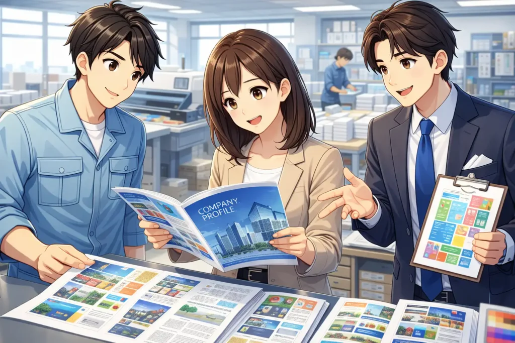 私が以前見た会社案内では、表紙のロゴ部分だけが少し盛り上がっており、そこに光沢が出る加工が施されていました。派手なデザインではありませんでしたが、手に取った瞬間に自然とその部分に目が行き、とても印象に残りました。このような細かな工夫も、ポストプレス工程によって生み出されています。