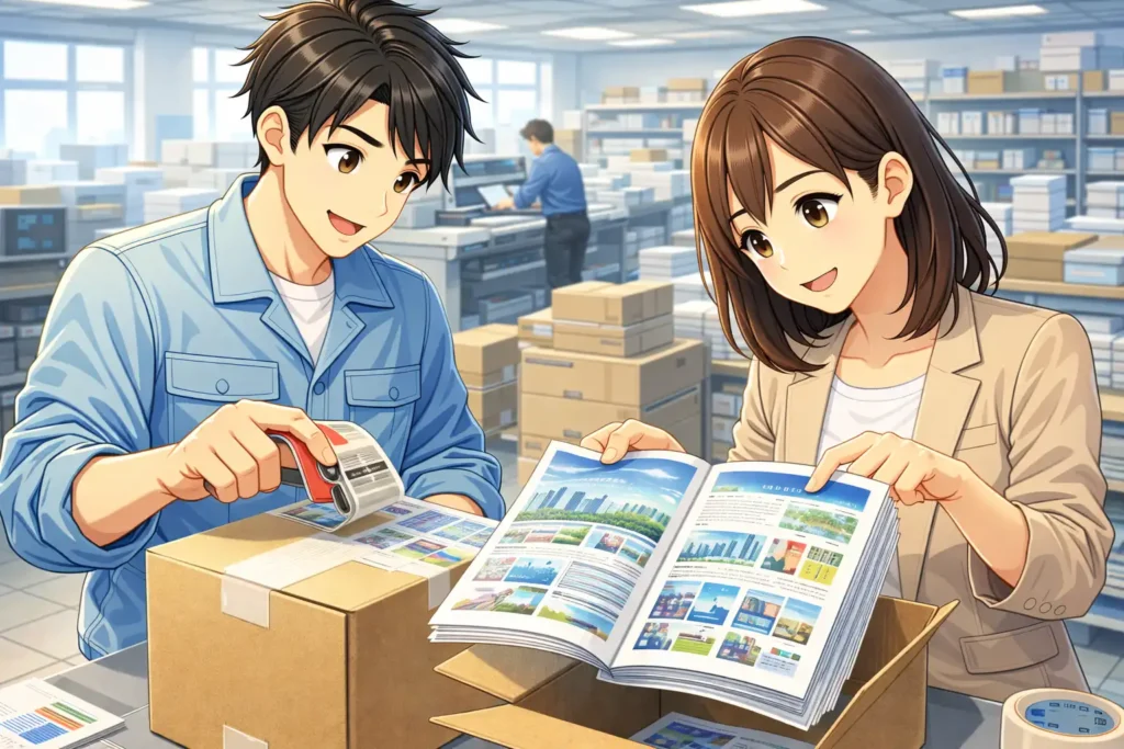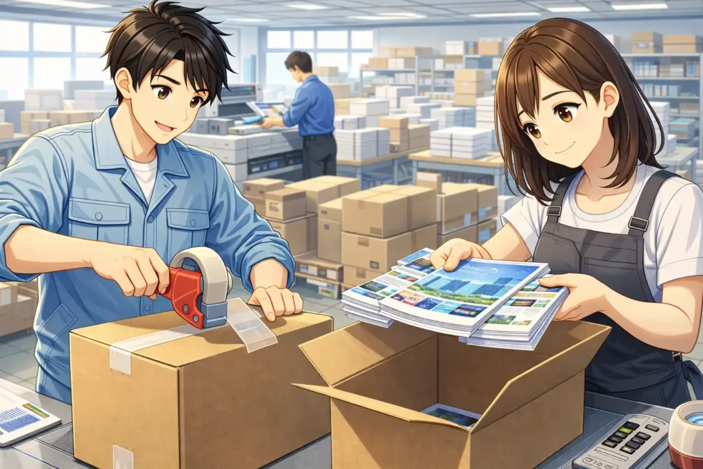 ポストプレスの工程は、断裁や製本、表面加工で終わりではありません。実際には、そのあとに検品や梱包、発送といった作業が続き、印刷物はようやくお客様のもとへ届けられます。この納品までの流れも、品質を保つためには欠かせない大切な工程です。
