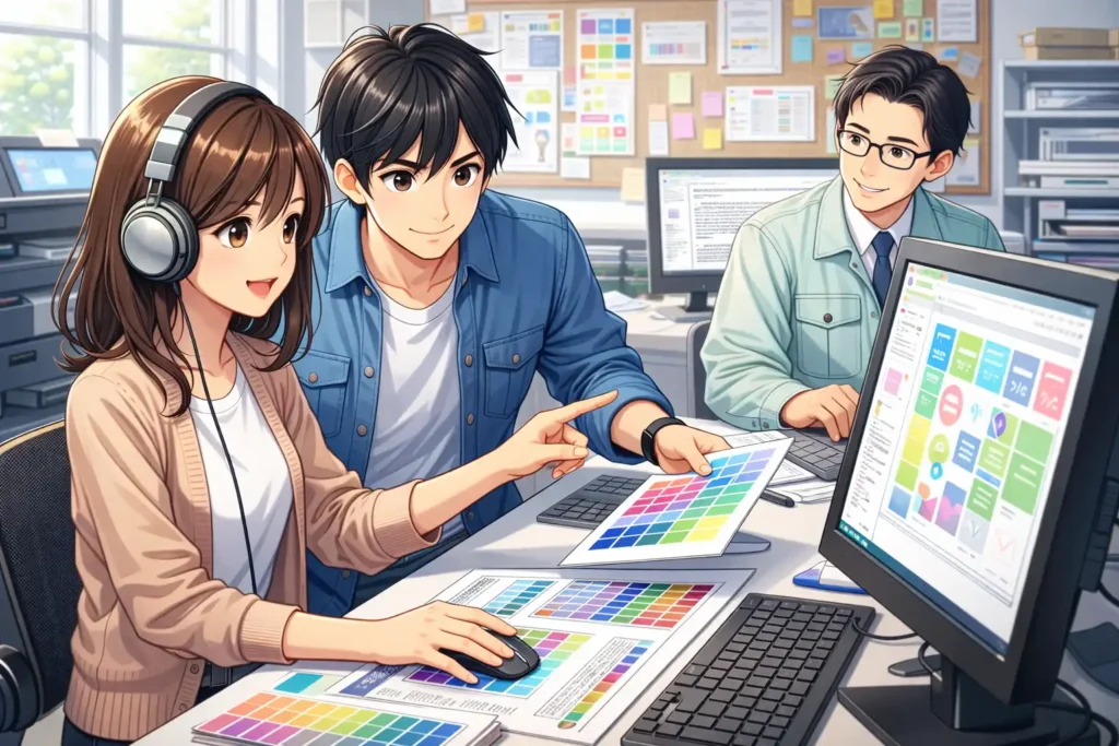 初心者の方が印刷を依頼するとき、「画面で見た通りの色でお願いします」と伝えることは多いですが、実際には完全に同じ色を再現するのは難しい場合があります。そのため、プリプレス工程では「できるだけ近づける」ための調整が行われています。重要な色がある場合は、事前に伝えておくことでより丁寧な色合わせが行われることもあります。