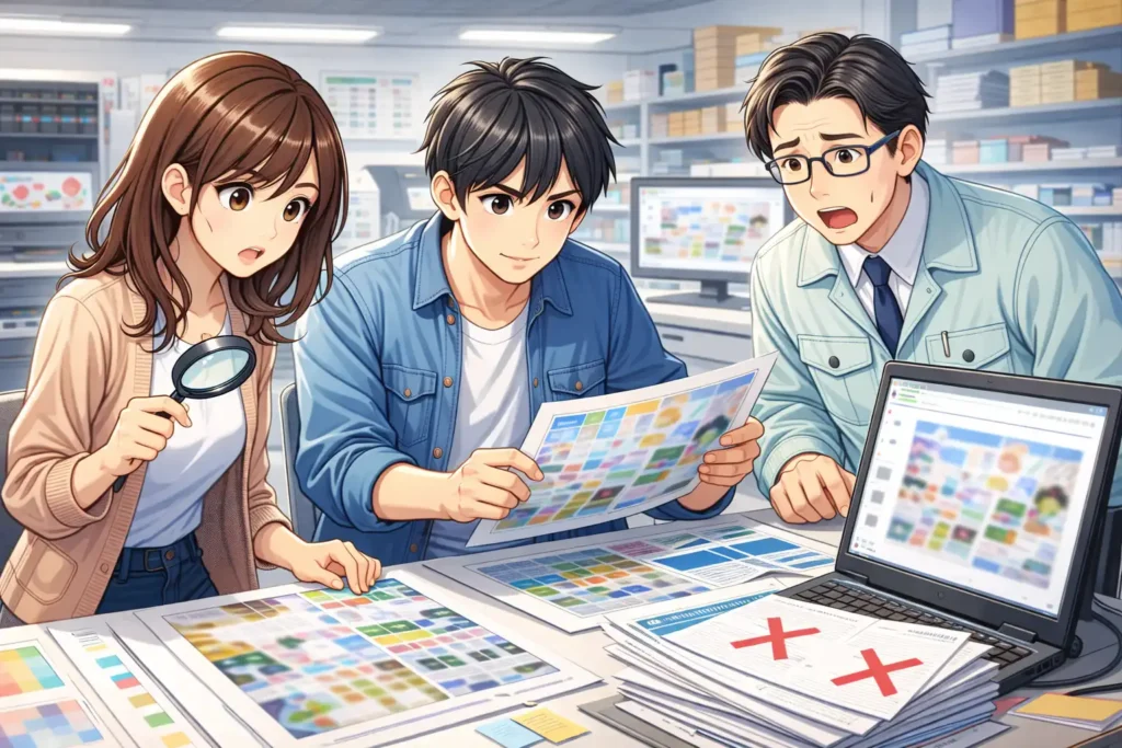 次に多いのが色味に関するトラブルです。画面で見た色と印刷後の色が大きく違うと、「思っていたイメージと違う」と感じてしまいます。これを防ぐためには、色味チェックや試し刷りをしっかり行うことが重要です。特に企業ロゴや商品写真など、色の印象が大切な部分については、事前に確認して調整してもらうと安心です。