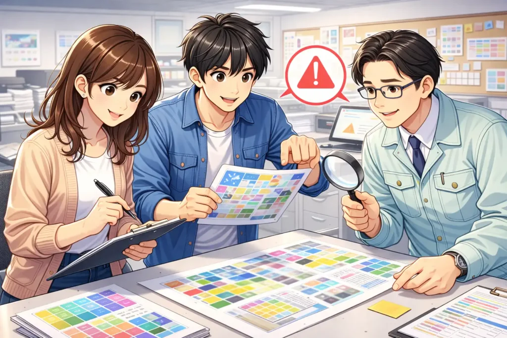 画像の画質不足、色味のズレ、文字の切れ、誤字脱字の見落としなどがよくあります。これらは事前の確認と調整で防げることが多いため、プリプレス工程を丁寧に進めることが大切です。