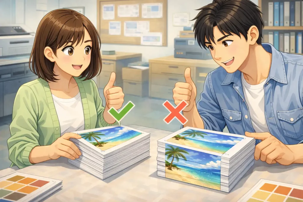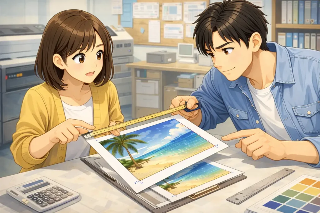 仕上がりサイズを正しく理解しておくことは、印刷トラブルを防ぐうえでもとても役立ちます。たとえば「思っていたよりも小さく仕上がった」「文字が端で切れてしまった」「デザインがずれて見える」といった問題の多くは、サイズの考え方を誤っていたことが原因で起こります。最初から仕上がりサイズを意識してデザインを作成すれば、こうした失敗を大きく減らすことができます。