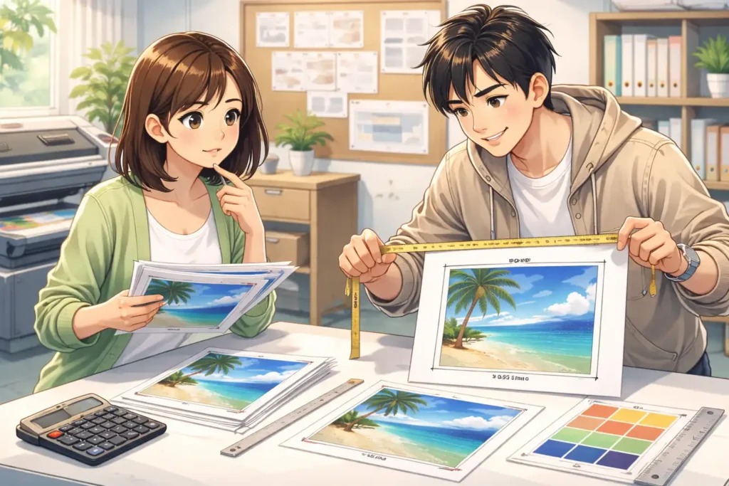 また、サイズが大きくなるほど印刷費用も高くなる傾向があります。用紙の量やインクの使用量が増えるためです。そのため、必要以上に大きなサイズを選ばず、目的に合った仕上がりサイズを選ぶことがコスト面でも重要になります。