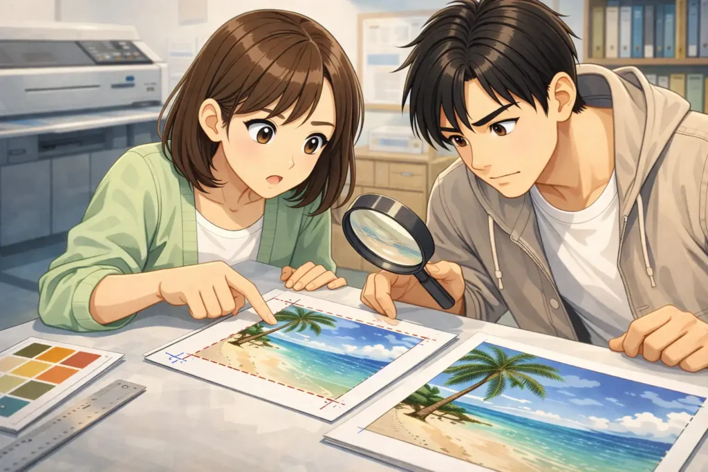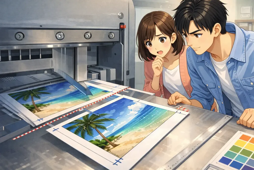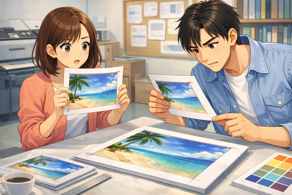 画面では拡大表示されていることが多く、実際のサイズ感と異なって見えるためです。また、紙に印刷すると文字や色の見え方も変わることがあります。さらに断裁ズレや紙の伸縮も影響するため、完全に同じ見た目にはなりません。実寸を意識することが大切です。