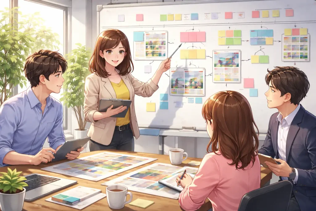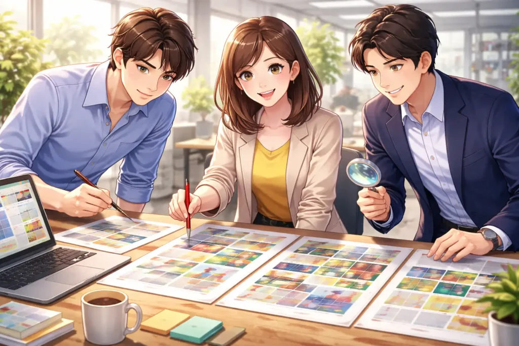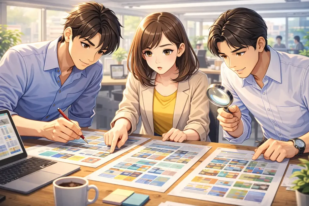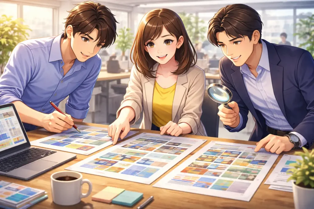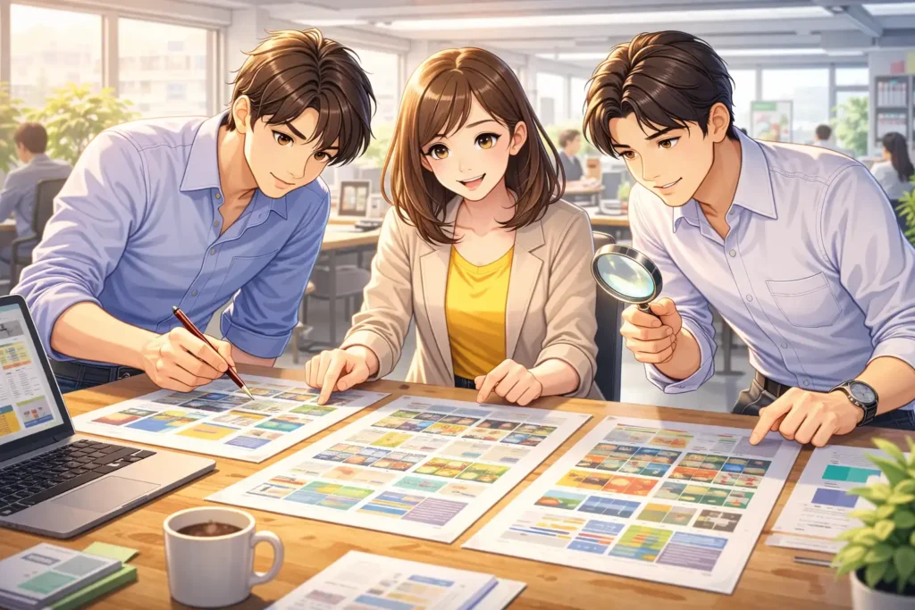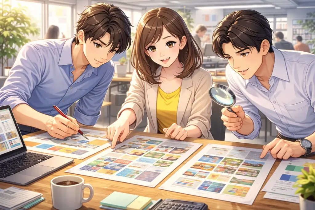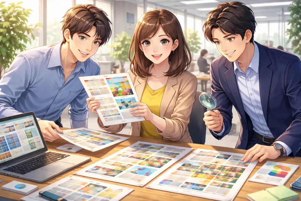 また、社内の承認プロセスにおいてもカンプは重要です。デザイナーだけでなく、営業担当や広報担当、場合によっては経営層も確認します。それぞれの立場から見たときに問題がないかをチェックします。同じカンプを見ながら話し合うことで、認識のずれを防ぐことができます。口頭説明だけでは伝わらない細かな部分も、実物があれば共有しやすくなります。