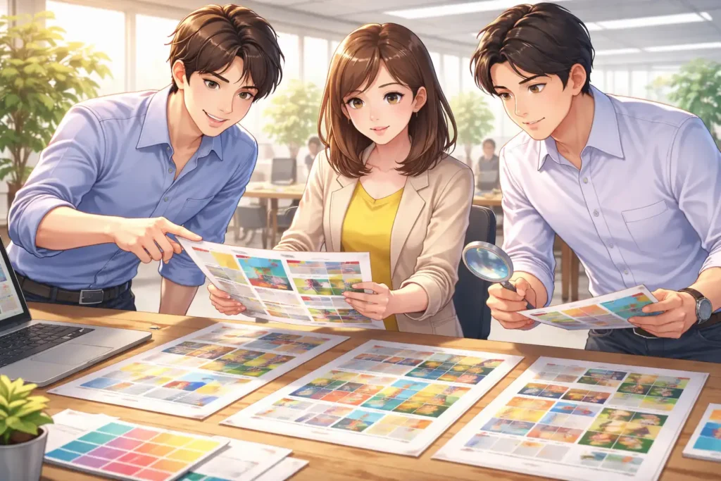 また、カンプ確認は社内のコミュニケーションを深める機会にもなります。同じ印刷物を囲みながら意見を交わすことで、伝えたい内容の優先順位や見せ方について共通認識が生まれます。この積み重ねが、今後の制作にも活きてきます。