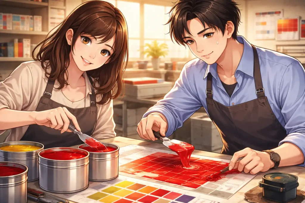 また、金赤は目立つ色であるため、わずかな違いでも気づきやすいという特徴があります。グレーやベージュのような落ち着いた色であれば、多少の差は目立ちにくいかもしれません。しかし金赤は鮮やかで視線を集める色です。だからこそ、5%や10%の配合の違いが仕上がりの印象に影響します。