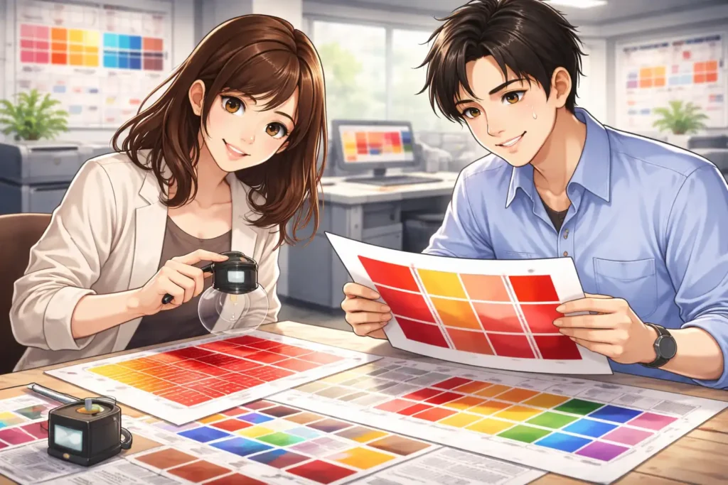 トラブルを防ぐために重要なのは、具体的な指定を行うことです。「金赤」という言葉だけでなく、CMYK値やDIC番号を明示することで、認識のずれを減らせます。可能であれば、過去に印刷した実物を見本として提示するのも効果的です。実物は何よりもわかりやすい基準になります。